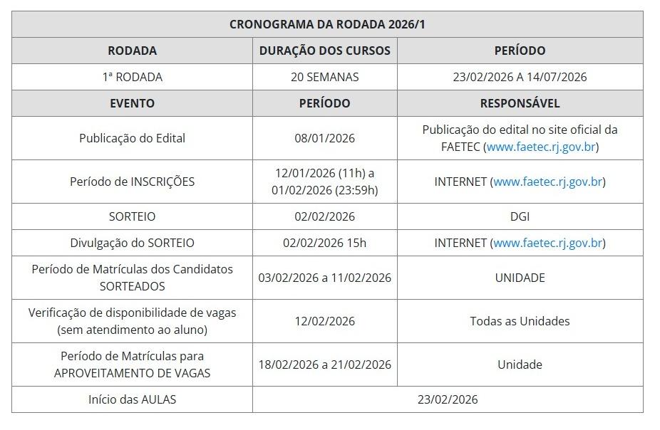 Todas as informações detalhadas — incluindo lista completa de cursos, endereços das unidades, documentação exigida e regras do processo seletivo — estão disponíveis no edital oficial da Faetec, publicado no site da instituição.